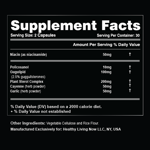 CholesterolShield Ingredients: Policosanol, Gugulipid, Plant Sterol Complex, Cayenne.